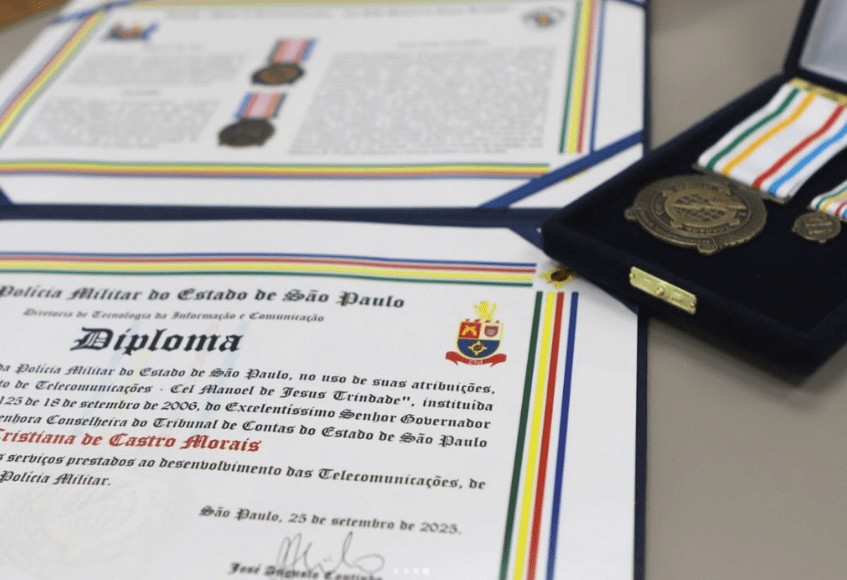 A presidente do Tribunal de Contas do Estado de São Paulo (TCESP), Cristiana de Castro Moraes, recebeu nesta quarta-feira (28) a Medalha do Mérito de Telecomunicação Horária, concedida pela Polícia Militar do Estado de São Paulo, por meio da Diretoria de Tecnologia da Informação e Comunicação (DTIC).
